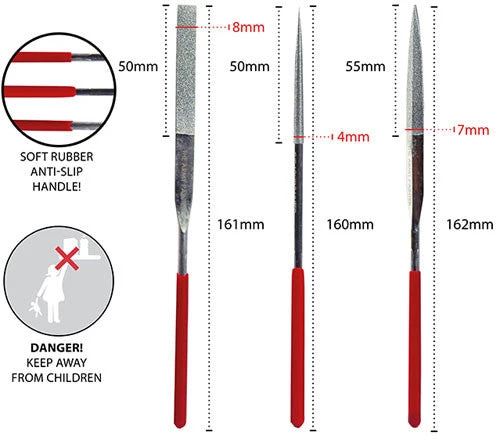 The original file set offers excellent value and quality for all modellers and wargamers. The 3 files are the most commonly used shapes and will help you clean and prepare your models for assembly as well as nicely remove mould lines. Works perfect with both metal, resin and plastic miniatures.