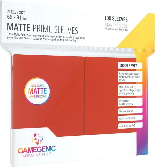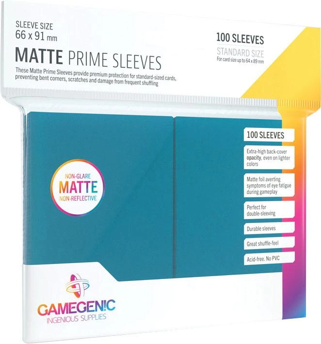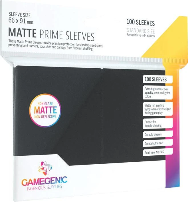 Card-sleeves are an essential requirement to protect your valuable gaming cards. These Matte Prime Sleeves provide a premium protection for standard-sized cards and prevent them from bent corners, scratches or damages by frequent shuffling. The matte front blocks annoying reflections at the sleeves, to ensure that the card is visible from all sides and avoiding symptoms of eye fatigue during gameplay. Due to their fine, matte back side players will experience a great shuffle feel and don’t to have struggle with slipping deck staples. The sleeves are optimized in size to ensure a professional protection and work perfectly for double-sleeving (sleeve-within-sleeve). One pack contains 100 sleeves, matching also larger deck formats.