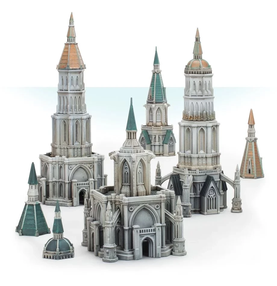 Add this Gothic aesthetic to your Adeptus Titanicus scenery with a set of buildings reflecting this style of Imperial architecture. The components in this set are modular, and can be configured and stacked in a variety of ways. Create multiple small buildings, several medium structures or a single large tower that can even hide a Battle Titan.