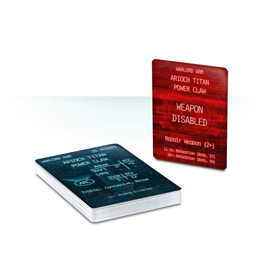Supplementing the weapon choices found in the Adeptus Titanicus Rules Set, and used in conjunction with the Command Terminals, these Weapon Cards are used to keep track of the armaments you’ve deployed on your Titan. Each of the 26 cards in this pack represents a weapon from your Warlord Titans, and fits snugly on to the weapon slots on their Command Terminals. When flipped, they are used to denote that the weapon is disabled. Included:
