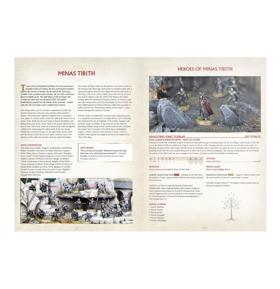 – 16 army lists for the forces of Good, including a brief background, points values, characteristics, special rules and Heroic Tiers for the following: The Fellowship, The Shire, The Rangers, Númenor, Minas Tirith, The Fiefdoms, The Dead of Dunharrow, Arnor, Rohan, Wildmen of Druaden, Rivendell, Lothlórien, Fangorn, The Misty Mountains, The Kingdom of Khazad-dûm, and Wanderers in the Wild;