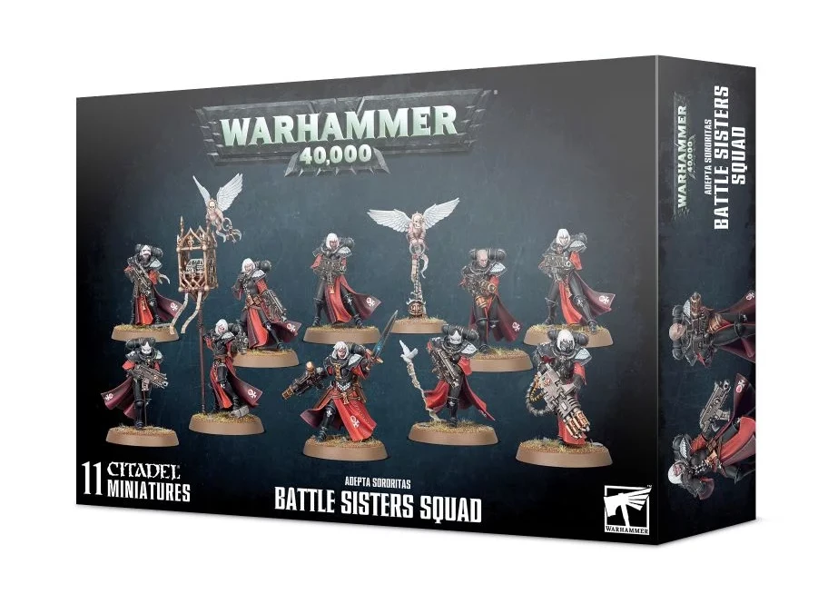 This kit builds 10 Battle Sisters and 1 Incensor Cherub. The Battle Sisters are equipped with boltguns, though up to two of them can be assembled with a special weapon (storm bolter, meltagun or flamer). Alternatively, one Battle Sister may carry a special weapon while another bears a heavy weapon (heavy bolter or heavy flamer). One of your Battle Sisters can carry a sacred Simulacrum Imperialis, with two variant options mounted atop the pole. The components also enable you to build a Sister Superior armed with a chainsword or power sword and a choice of ranged weapons, including a condemnor boltgun or combi-weapon (combi-flamer, -melta or -plasma).