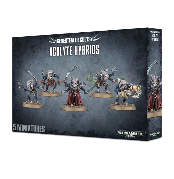 Basking in the sheer alien glory of the patron that infected them, Acolyte Hybrids croon and hiss in the gloom. When the time comes to throw off the torn robes they use to disguise their foulness, the Acolyte Hybrids crawl up to the surface and into the sunlight, their grotesque faces twisted in subhuman glee. They display a bizarre blend of the species from which they hail – the speed of a Purestrain Genestealer twinned with human cunning is a potent combination. These hybrids fire off volleys of pistol fire, before descending on the enemy in a riot of claws, close combat weapons and screamed praise to their masters.