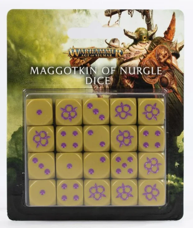Channel the infernal favour of Nurgle with this set of dice inspired by his foremost champions, the Maggotkin.