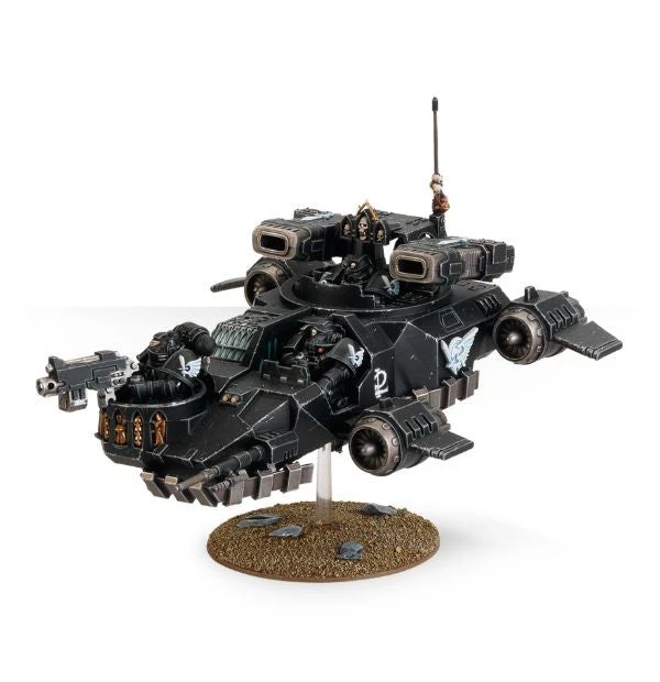 The Ravenwing Darkshroud displays icons and structures from Caliban, evoking glorious religious imagery such as angel wings, shrouded statues, parchments and stained glass with lead frame. It possesses a pulpit-like cupola from which a Space Marine shoots others with either a heavy bolter or assault cannon, and is covered in metal panels, rivets, engines, all in the tough and robust style of the Space Marines. Three Space Marines are positioned throughout the vehicle.