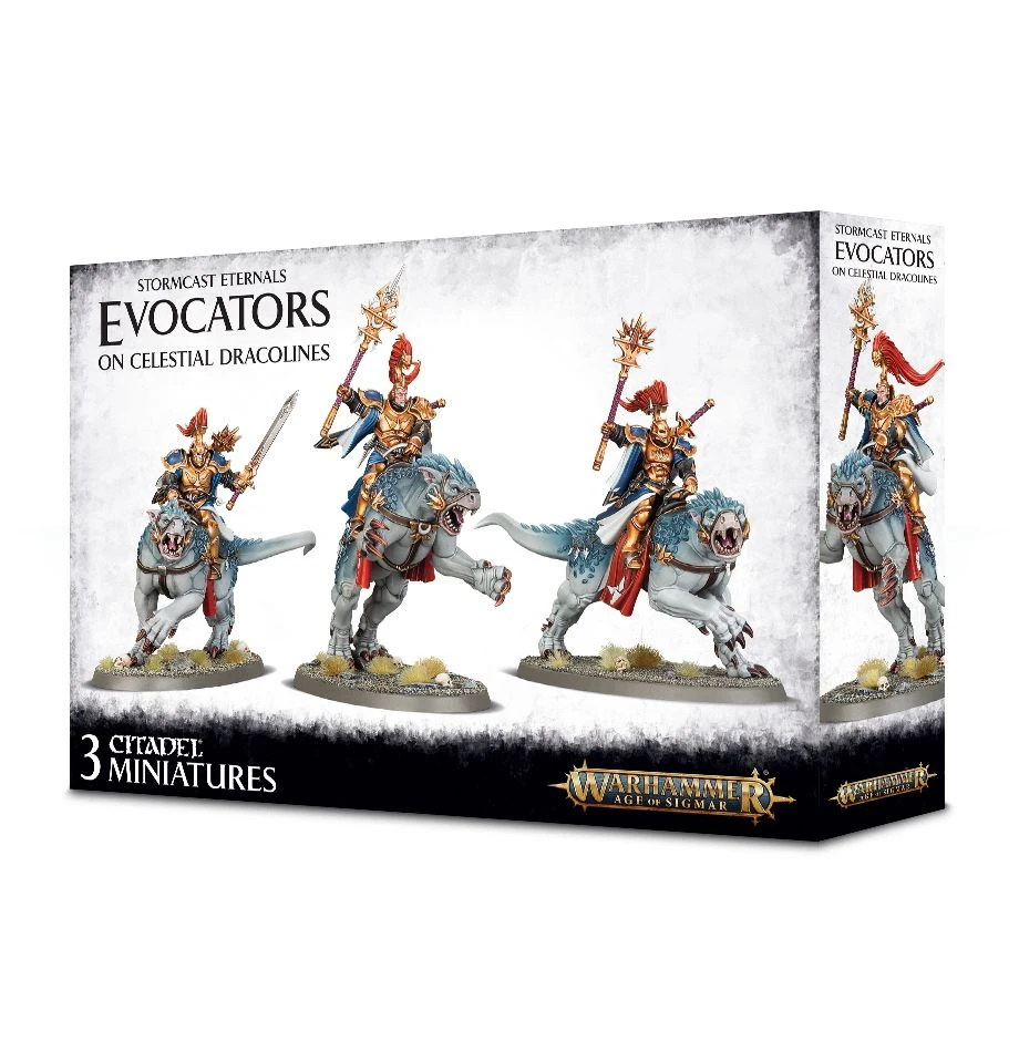 This multi-part plastic kit contains the components necessary to assemble 3 Evocators on Celestial Dracolines. They are clad in Stormcast Eternals armour, with cloaks, tabards and ornate helms denoting their status as lightning-empowered shock troops of Sigmar. Dotted around their forms is the symbol of the Sacrosanct Chamber, the 3-marked anvil. Each wields a tempest blade and stormstave, with the option for 2 to carry a grandstave instead. The Dracolines they ride are large and fearsome, their forms incredibly dense and muscular; each of their 4 feline limbs ends in terrible claws, and their heads are squat and heavy. The Dracolines have little needs for armour, merely accessorised with a set of reins and saddle each.
