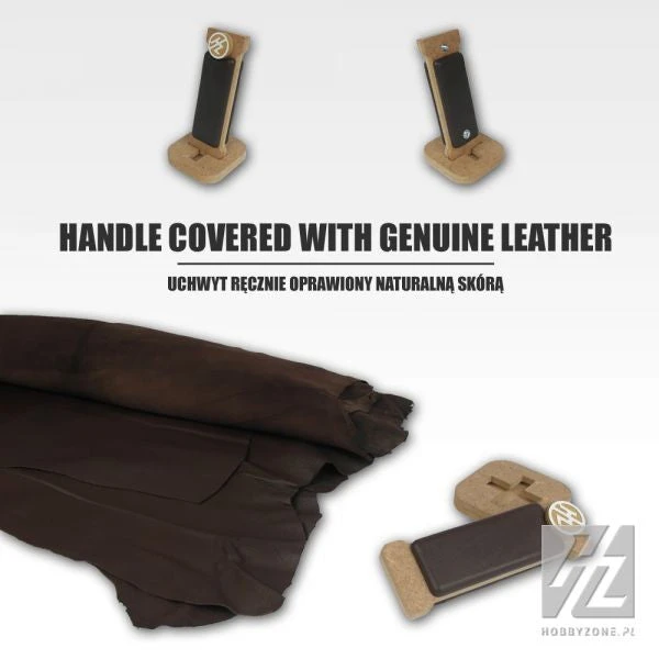 The Painter Grip is a figure painting jig that features a leather-covered handle for comfort while painting miniatures, figures and small models]. The Grip is covered with genuine leather which makes even prolonged use comfortable in the hand. The knob at the top of the Grip with the HZ logo controls the clamp that holds your figure or model. A base is included to keep the Grip standing while taking a break or waiting for paint to dry.