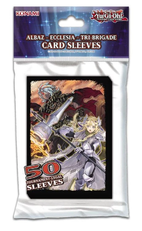 The Albaz — Ecclesia — Tri-Brigade Card Sleeves feature the artwork of Fallen of Albaz and Dogmatika Ecclesia, the Virtuous, both of which made their debut in the core booster set, Rise of the Duelist. These Card Sleeves are perfect for keeping your cards safe when Dueling against destructive forces!